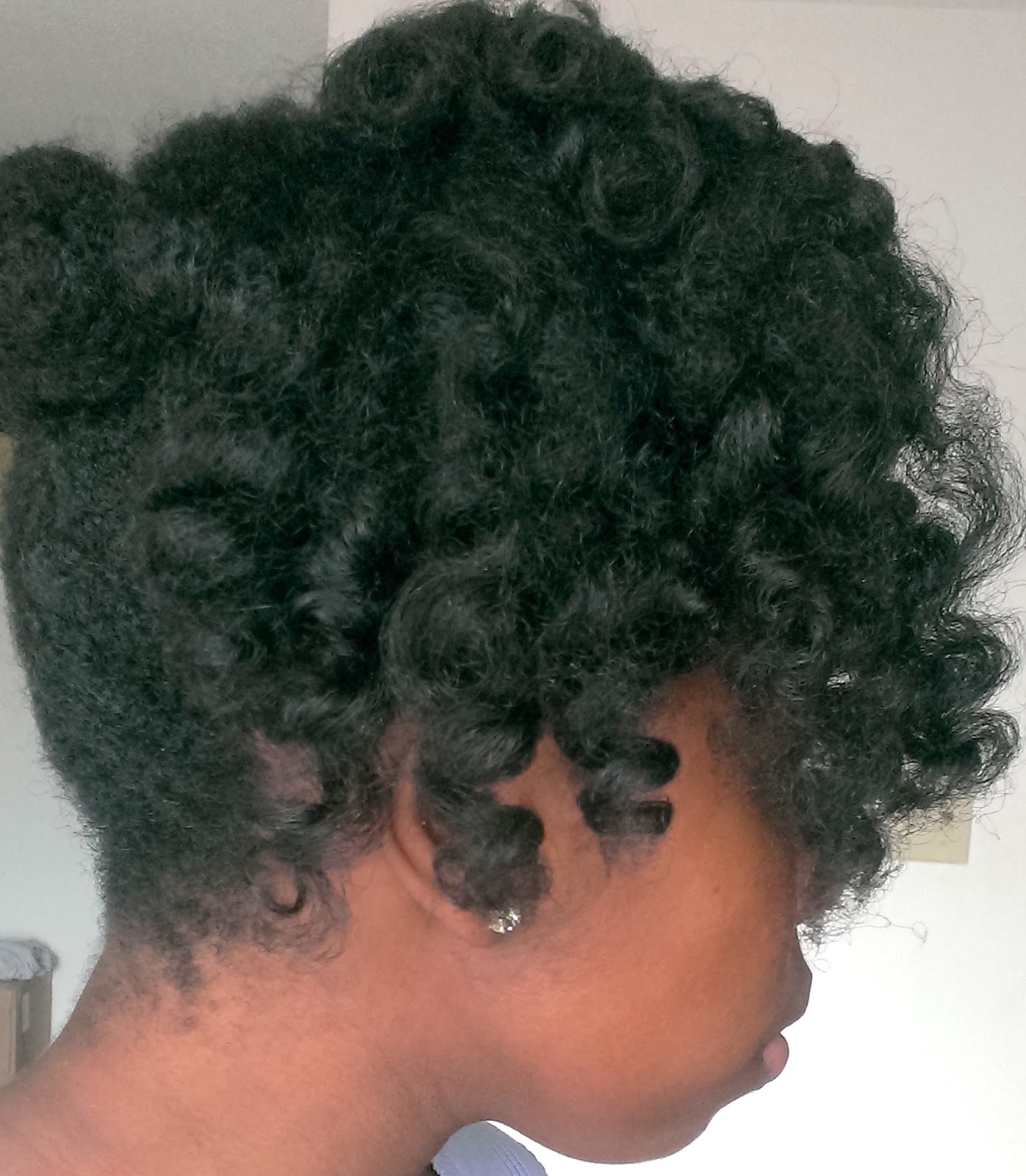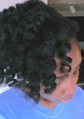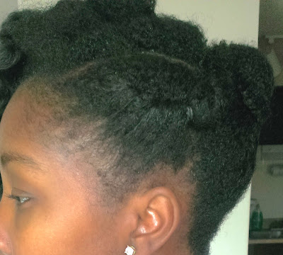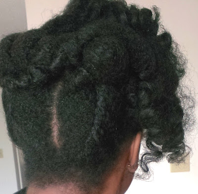 If you can’t tell what’s going on, its two tuck and roll twists from the back to the front. There are also tuck and roll twists above my ear, one on each side. The ends of those tuck and roll twists were two-strand twisted and crisscrossed at my crown.