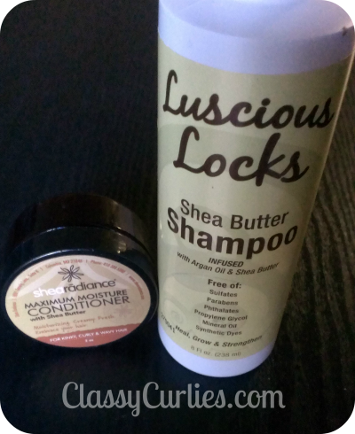 I also decided to try out two new products today. I washed with Luscious Locks Shea Butter Shampoo and I deep conditioned with Shea Radiance Maximum Moisture Conditioner. I deep conditioned for 30 minutes under a cap and rinsed.
